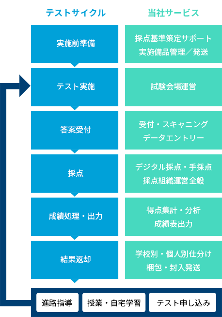 試験会場運営(試験監督)、答案の回収、スキャニング、デジタル採点、手採点、解答データ化、成績表出力、結果返却など、付加価値の高いアセスメントサービスを、当社ならではのトータルソリューションでご提供致します。